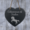 Vakkert skiferskilt formet som et hjerte med hampetau for enkelt oppheng. Skiltet graveres med laser som bleker skiferen. Skiltet er derfor meget holdbart og kan brukes til alle anledninger både ute og innendørs.